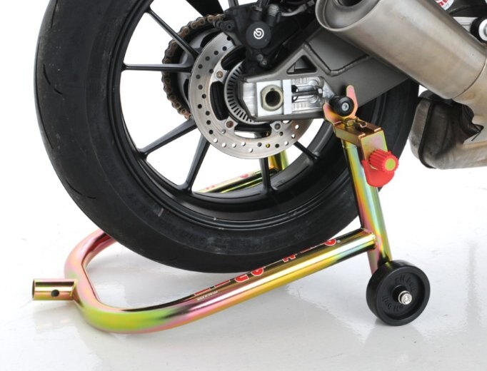 The SS Rear Stand can be used as a Standard or Spooled Rear Stand by flipping the top supports over. It is width adjustable to fit most modern sport bikes. The Pit Bull rear motorcycle stand was designed as a modular platform which allows SS, Standard, 999, and GP top supports to be used interchangeably. Sold complete with top supports. Spools sold separately. Pit Bull stands are known for our distinctive gold and red finish and are not available in other colors.