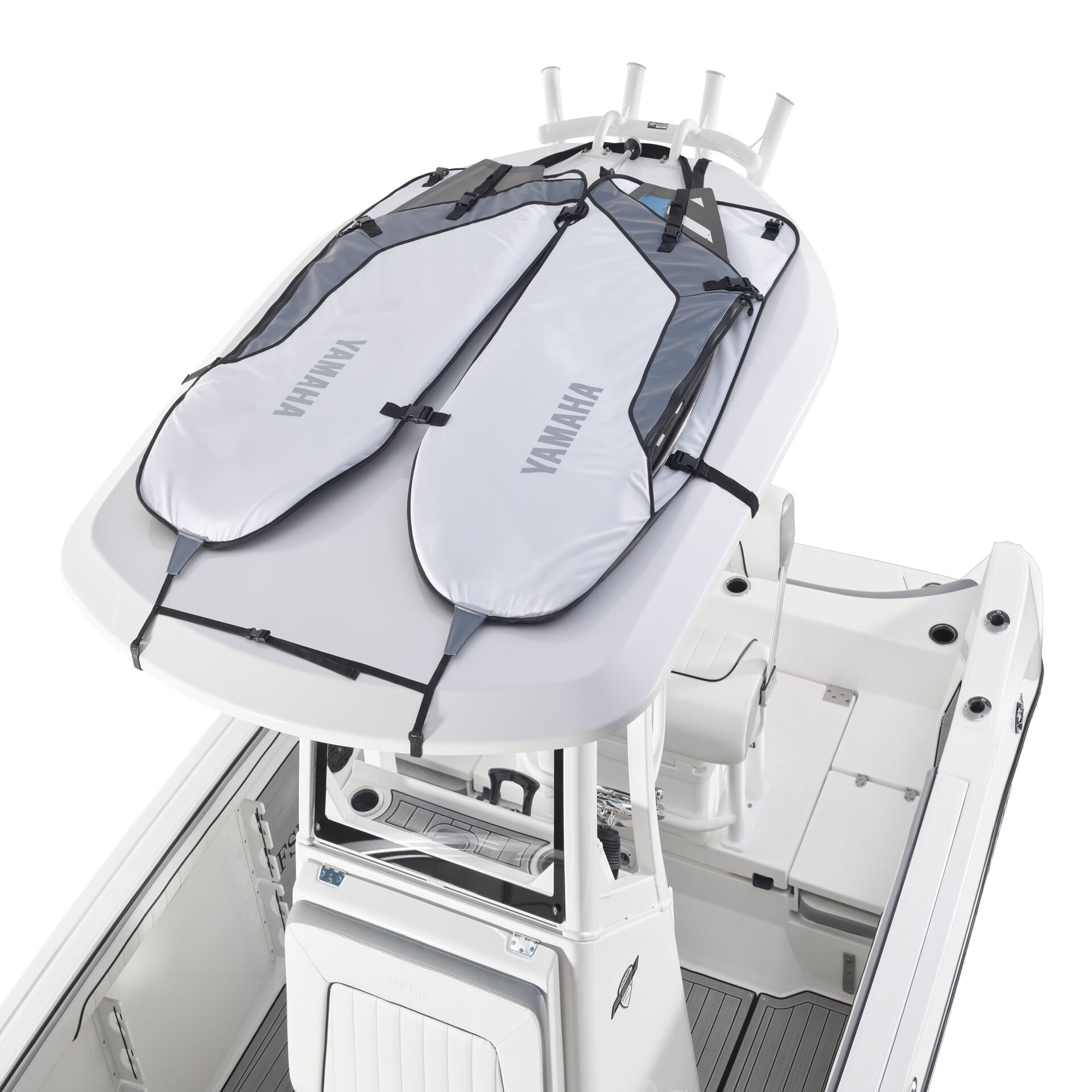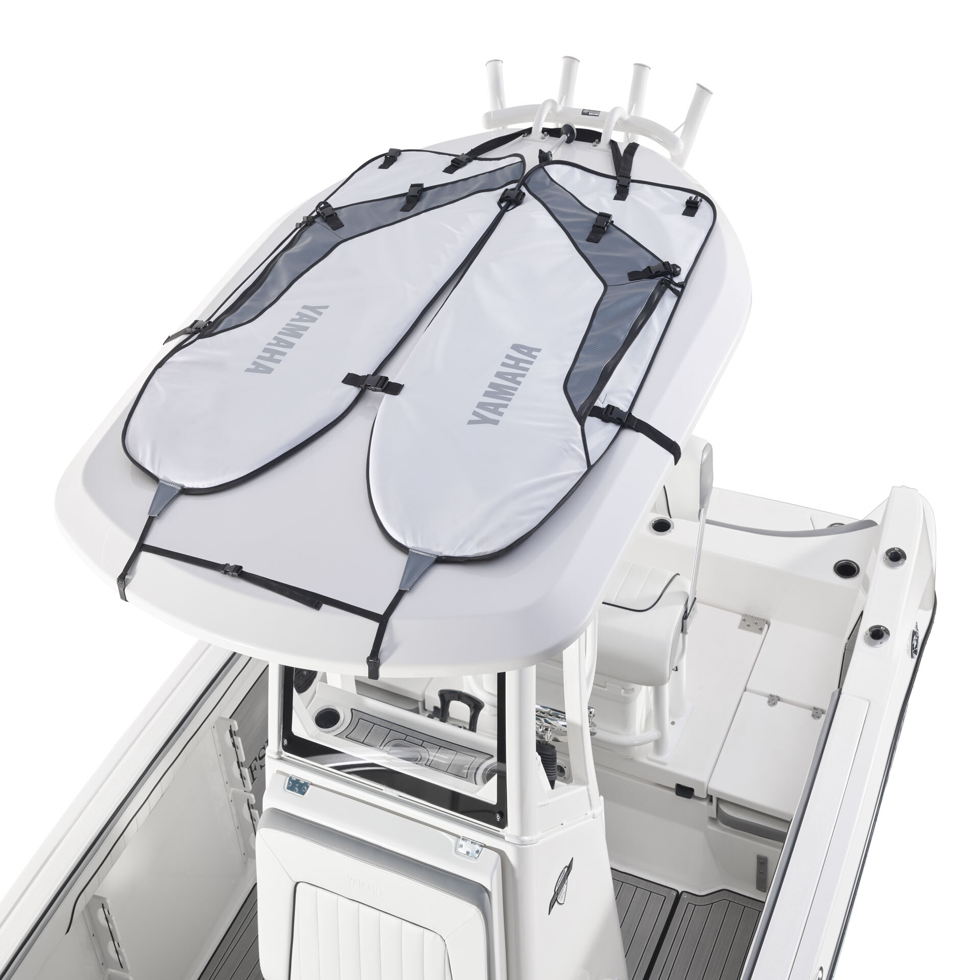 Fabric T-top carrier to carry 2 boards, or up to 2 tubes freeing up cockpit space in the boat! The included tie-down straps work with both boards or tubes.
