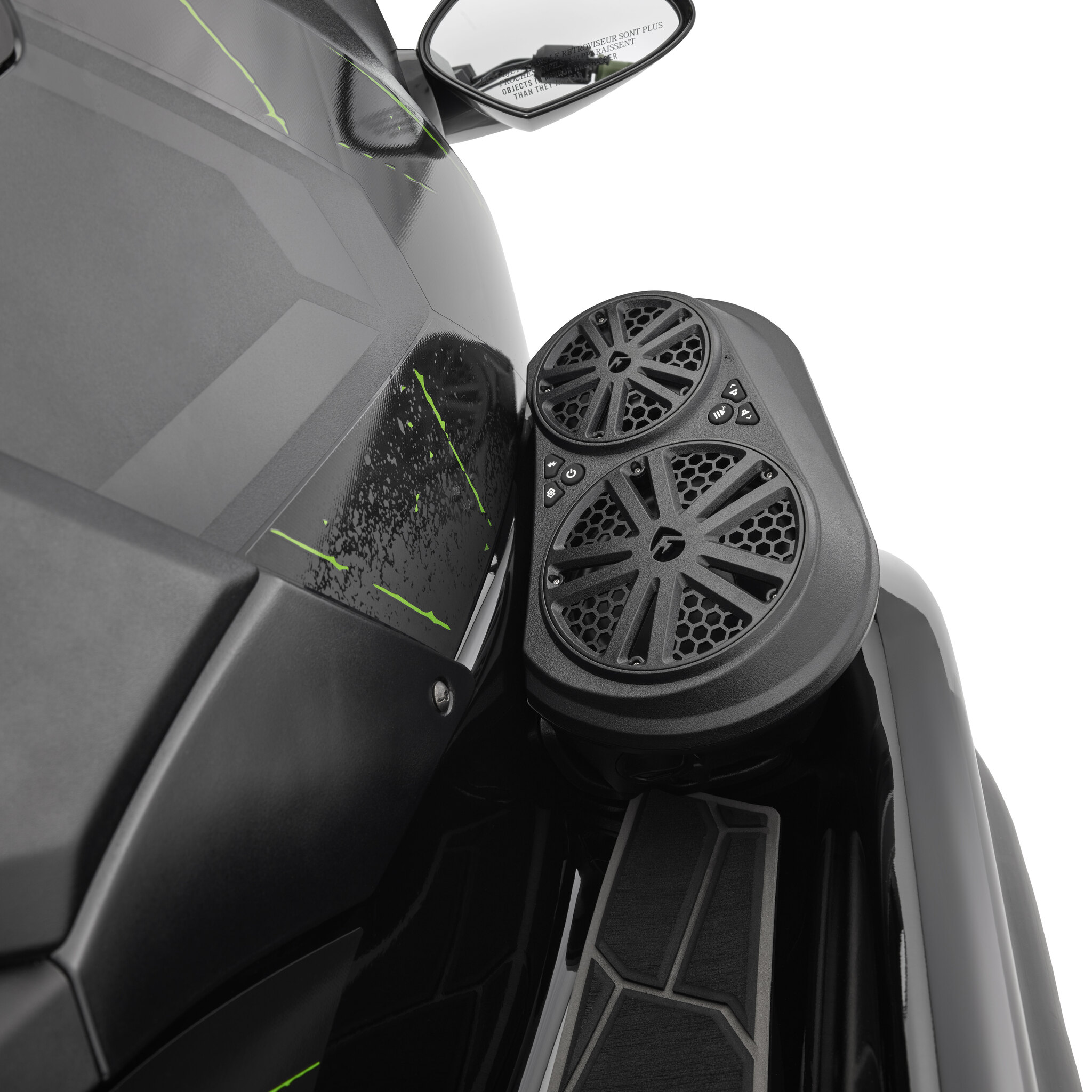 Removable, floating, wireless Bluetooth footwell speakers with new EcoCast technology. Mounting brackets are permanently installed on unit. Features a quick-release for charging, listening on the beach or while floating on the water.