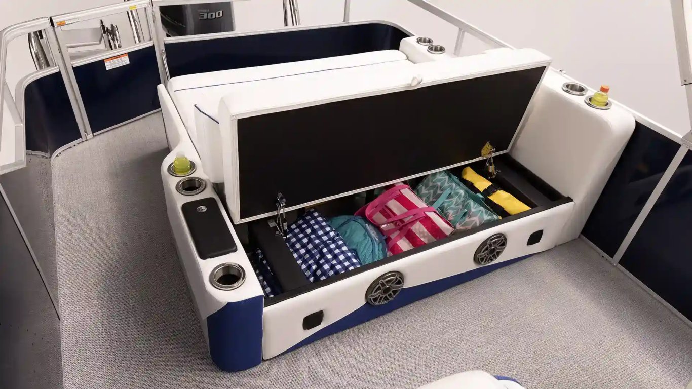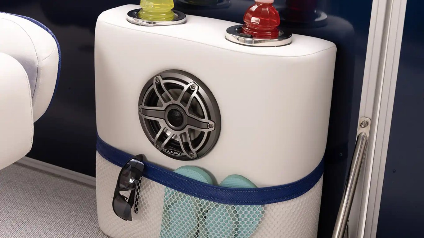 Located beside the passenger helm seat, this station keeps essentials with easy reach. Built-in cupholders and an integrated speaker ensure comfort and convenience.